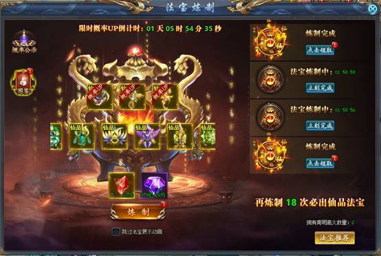 每日消耗一些资源和道具可以进行法宝炼制,炼制时间结束即可免费获得法宝。