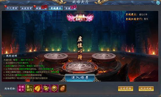 本服皇城争霸,每周一,周四定时开启。以宗门形式争夺皇城归属权。