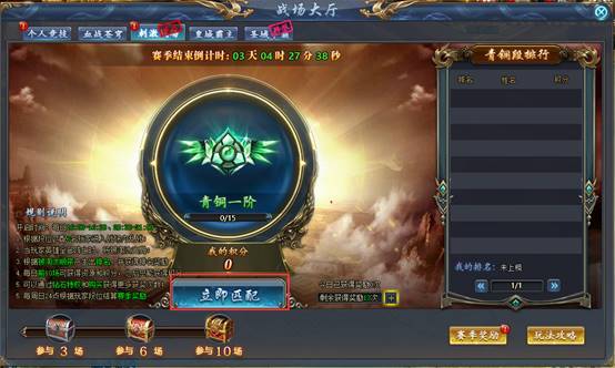 刺激战场为战区匹配对战玩法。每次匹配6名玩家。在战场内玩家的英雄全部阵亡则被淘汰出局。根据被淘汰的顺序产生1~6名,并获得排名奖励。