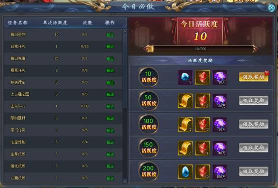 游戏内的日常活跃任务集合。完成今日必做会增加活跃度,活跃度达标可以领取奖励。