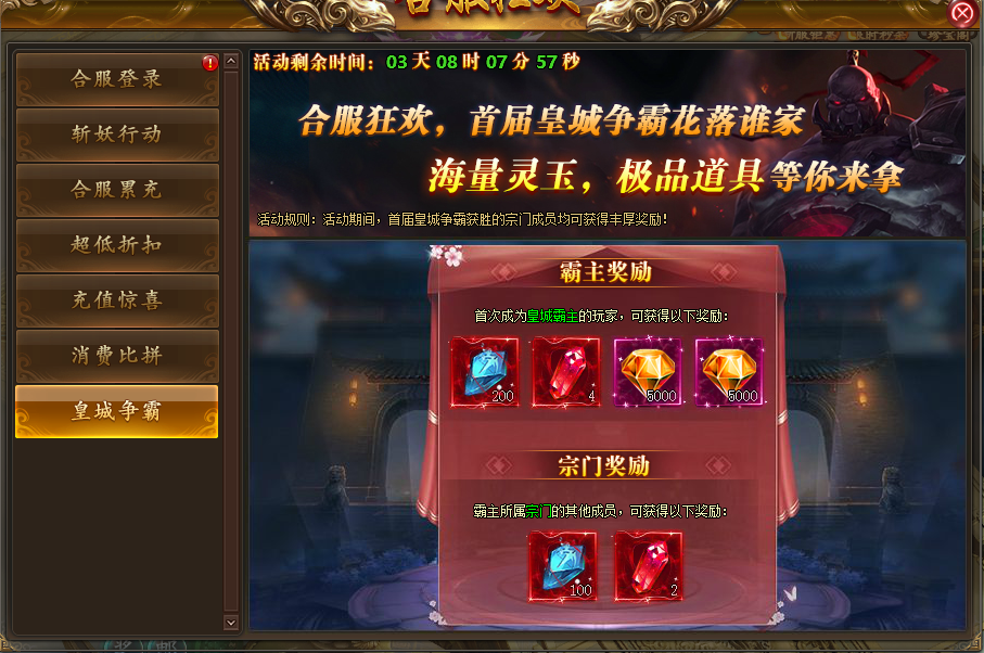 【活动内容】合服后,首届皇城霸主所在宗门及宗门宗主获得丰厚奖励!