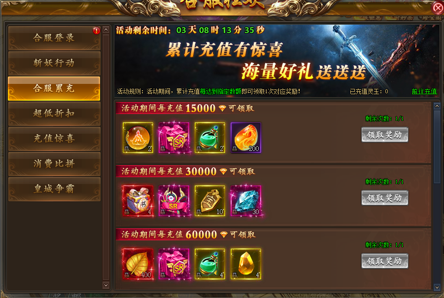 【活动内容】活动期间,累计充值达到指定金额即可领取1次对应奖励!